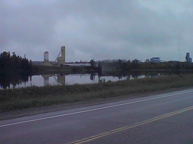 Our van was nowhere to be seen as I entered the mine site. Stopping at a fork in the road, I was contemplating which direction to take when a pickup truck bearing the mine's logo pulled up. After confirming that I was with Tour du Canada the driver directed me to our designated area. I cycled to it. Nothing was there—just a puddle-strewn expanse of rocky dirt. Leaning my bike against a nearby fence I mentally prepared to simply stand in the rain and wait. After a few minutes of this, getting colder and wetter, I set about poking my nose into the ATCO trailer/offices inside the fenced compound, eventually finding some warm bodies. Quick-talking myself inside for a coffee I met Ralph, a geologist working at the site but not directly employed by the mine. He and two or three others shared this large mobile home, using it for both offices and living quarters. Ralph was a good person to get to know. He later took pity on all of us by offering indoor sleeping space and the use of his clothes dryer for our completely soaked day's riding clothes. And my soaked sleeping bag, I discovered on Jeff's arrival. A corner of the protective tarp had slipped, exposing it to the rain until Jeff got up and loaded the van. The dryer was a godsend for all of us.