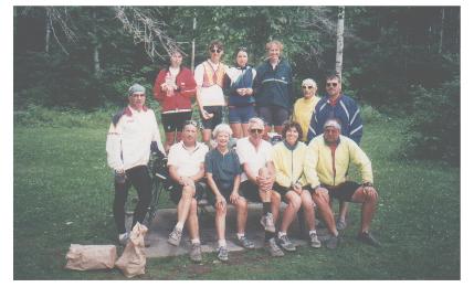 About halfway to our campground in Nipigon we came upon the van, pulled over at the Pearl River Rest Area. Cold meats and salads covered a picnic table. How we enjoyed Jeff's treat—this lunch was a terrific change from the daily PB sandwiches. We especially loved the tub of butterscotch ice cream presented for dessert, knowing that we absolutely must eat it right now. It was melting fast and there was no way to save it. Randy, Bob and I did our best to not let any go to waste, ably assisted by Albert who was also ever-ready for ice cream. A group photo session then ensued as tribute to reaching the halfway point of our odyssey. A non-suspecting stranger volunteered to be our photographer, only too late discovering there were 11 or 12 cameras to operate before he could rejoin his family. Our joyous mood was contagious, though, and he happily clicked away, one after another, until everyone had their memento of this unique occasion.